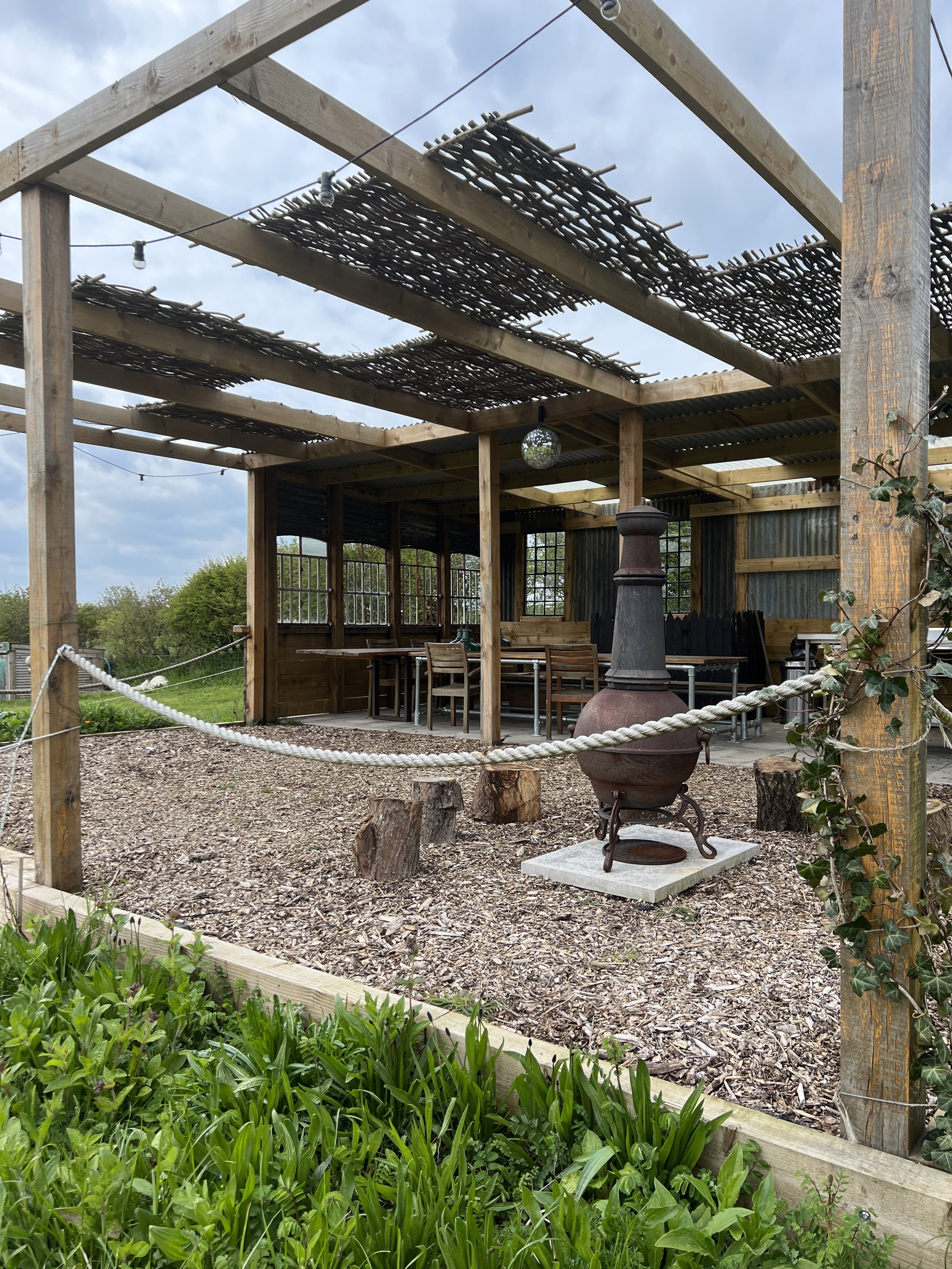 Shepherd’s hut with communal upright fridge, freezer and book exchange.